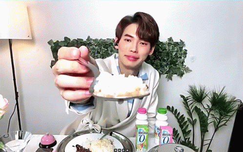 Win Metawin holds up a spoonful of rice, looking hungry and ready to eat.
