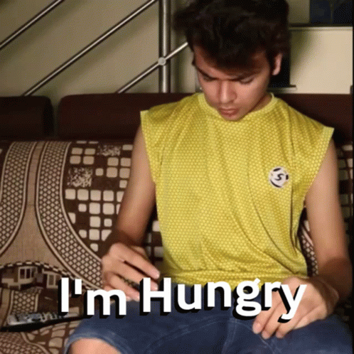 Grish Majethiya sits on a couch, holding his stomach and expressing his hunger with the text 'I'm Hungry'.
