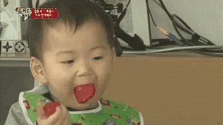 Minguk, wearing a green bib, happily eats a red treat, possibly a strawberry or candy, with a curious expression.