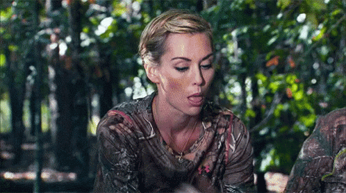 Woman in camouflage making a funny face with her tongue out, possibly giving a thumbs down gesture.