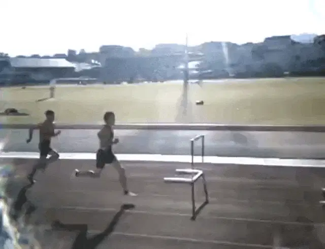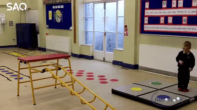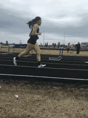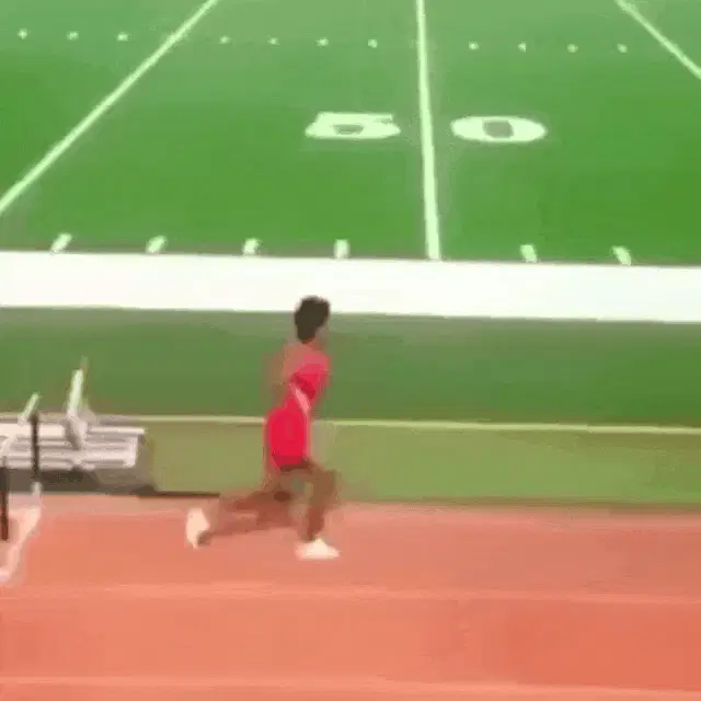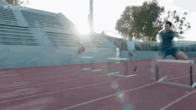 A vibrant cartoon girl in a green outfit stretches her leg over a hurdle, preparing for a race.