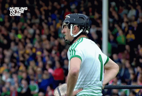 A hurling player in a green and white jersey with number 1 looks disappointed on the field after a play.