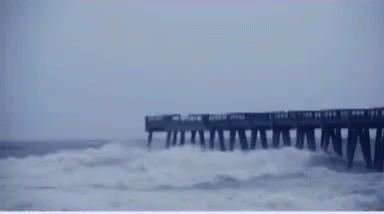 Powerful waves crash against a pier during Hurricane Harvey, showcasing the storm's intensity.