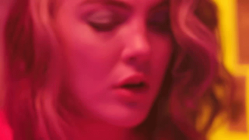 Evie Irie's face in a close-up, illuminated by strong pink and yellow lighting, with her eyes closed.
