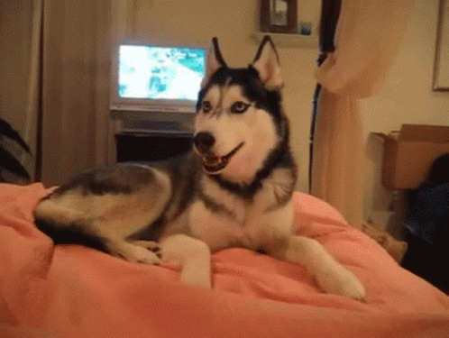 A beautiful Siberian Husky with blue eyes lies on a bed, appearing to talk or vocalize to the camera.