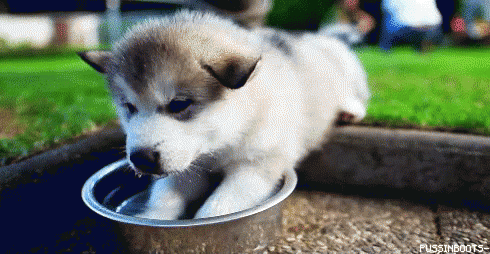 An adorable husky puppy stands in a metal bowl, splashing and playing with water outdoors.