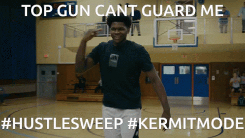 Man on basketball court with "Top Gun Can't Guard Me" text and "Hustle Sweep" hashtags.