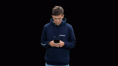 A student from Hogeschool Van Amsterdam reacts with shock and surprise to something on his phone.