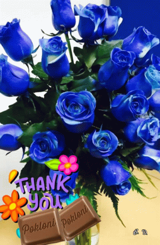 A beautiful bouquet of blue roses with a 'Thank You' message, accompanied by 'Pokloni' chocolates.