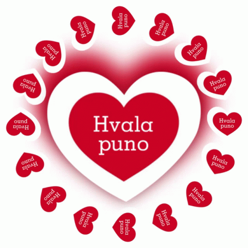 Red and white hearts expressing gratitude with 'Hvala puno' text, surrounded by smaller hearts.