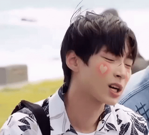 Hwang In Yeop as Han Seojun from True Beauty, with cute heart stickers on his cheeks.