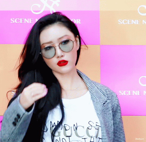 Hwasa striking a pose with long black hair, sunglasses, and bold red lipstick, wearing a plaid blazer.