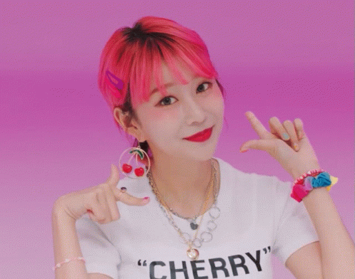 Hyebin from Momoland with vibrant pink hair, wearing a 'CHERRY' shirt and cherry earrings, posing.