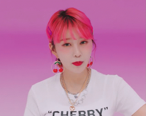 Hyebin from Momoland with vibrant pink hair, wearing cherry earrings and a 'CHERRY' t-shirt.