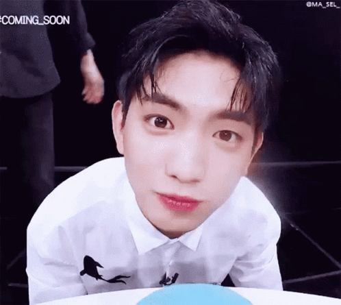 Hyeongseop Hyeongseob winks playfully at the camera, wearing a white shirt with a black design.