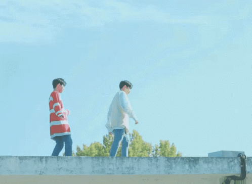 Hyeongseop and Euiwoong walk along a concrete ledge under a bright blue sky, with trees visible below.