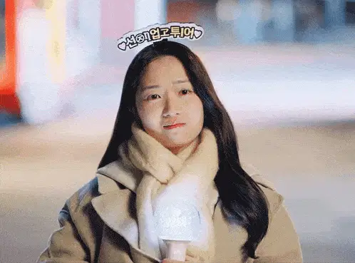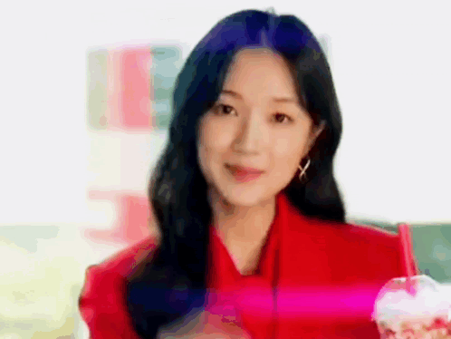 Kim Hyeyoon smiling brightly in a red jacket, holding a cup of milkshake.