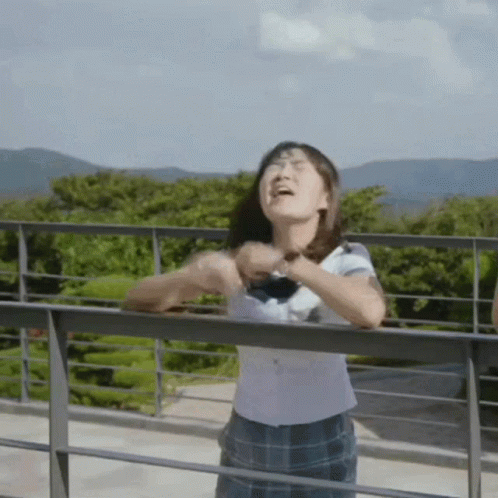Actress Kim Hye-yoon in a school uniform, arms outstretched, looking happy and free on a balcony.