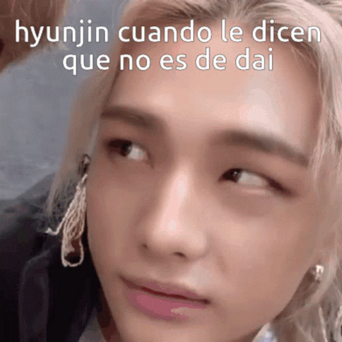 Hyunjin of Stray Kids reacts to the Spanish caption 'hyunjin cuando le dicen que no es de dai'.