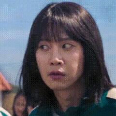Hyunju's surprised reaction from Squid Game, followed by a humorous cat meme with a similar hairstyle.