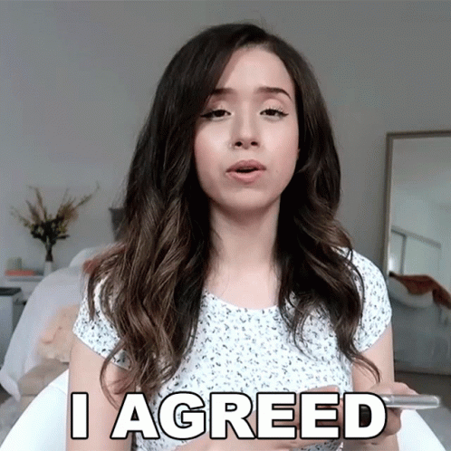 Imane Anys, known as Pokimane, speaks to the camera with the caption 'I AGREED' displayed.