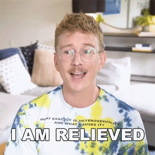 Tyler Oakley expresses relief, saying 'I am relieved' while wearing glasses and a tie-dye shirt.