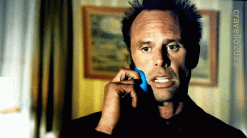Walton Goggins as Boyd Crowder on a phone call, with the text 'I await my ENLIGHTENMENT' overlaid.