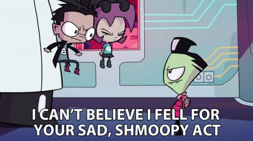 Zim, Dib, and Gaz in a scene from Invader Zim, with Zim expressing disbelief: "I can't believe I fell for your sad, shmoopy act."
