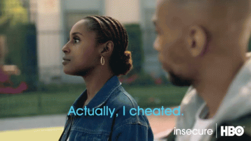 A woman with braided hair confesses to cheating while standing next to a man, revealing 'Actually, I cheated.'