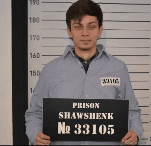 A man in a prison uniform holds a sign that changes from 'Shawshank No 33105' to 'I did say that,' confirming 'Yes!'