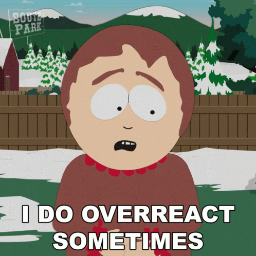 Sharon Marsh from South Park admits, "I do overreact sometimes," with a worried expression.
