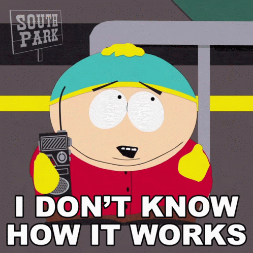 Eric Cartman from South Park holds a walkie-talkie, expressing confusion with 'I don't know how it works.'