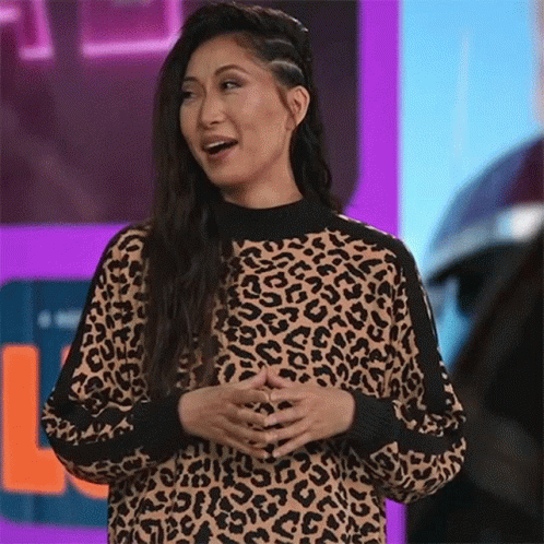 Mari Takahashi shrugs 'I don't know' in a stylish leopard print sweater, expressing uncertainty.