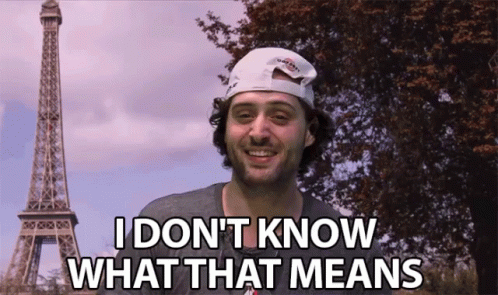 Blake Webber, with the Eiffel Tower in the background, humorously states, 'I don't know what that means.'