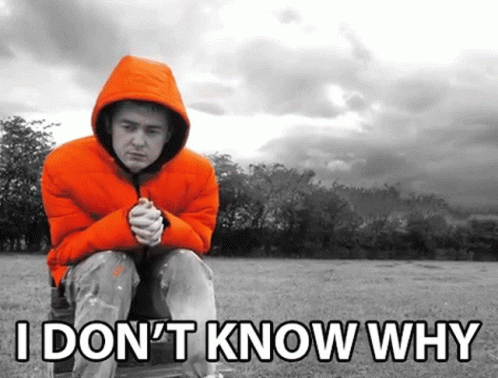 Man in orange jacket sits in a field under a cloudy sky, with the caption 'I Don't Know Why' displayed.