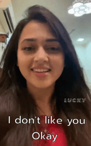 Tejasswi Prakash smiling and playfully saying "I don't like you Okay" directly to the camera.