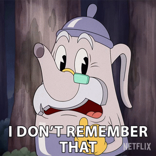 Elder Kettle from The Cuphead Show says "I don't remember that" with a confused expression.