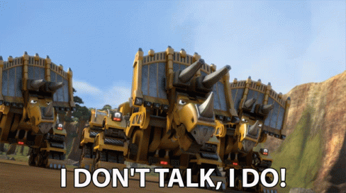 Dozer, the Dinotrux character, declares "I don't talk, I do!" while moving forward with other rhino-trucks.