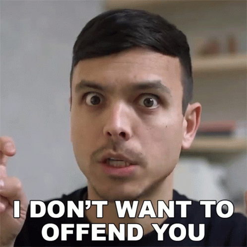 Mitchell Moffit with a surprised expression, saying 'I don't want to offend you'.