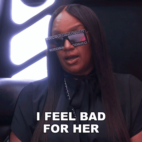 Jackie Christie, wearing large Gucci sunglasses, expresses empathy by saying 'I feel bad for her'.