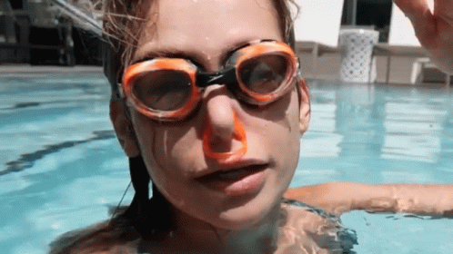 Sylvia Gani in a pool, wearing goggles and a nose plug, expresses feeling like she's drowning.