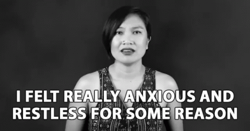 A woman expresses feeling anxious and restless, speaking directly to the camera against a black background.