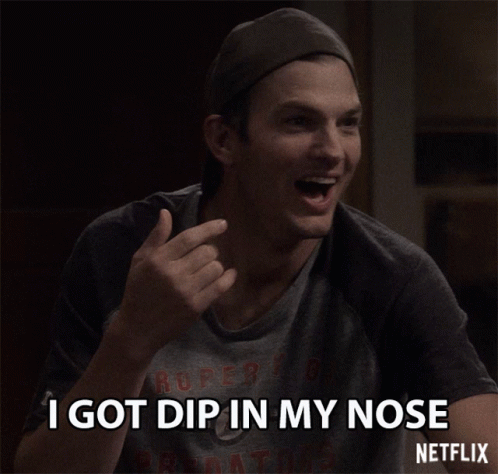 Ashton Kutcher points to his nose, exclaiming 'I got dip in my nose' in a humorous moment.