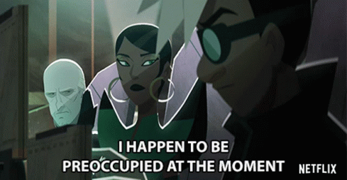 Animated characters, including Sharon Muthu, Dr. Bellum, and Countless Cleo, are shown with the quote 'I happen to be preoccupied at the moment' from Netflix.