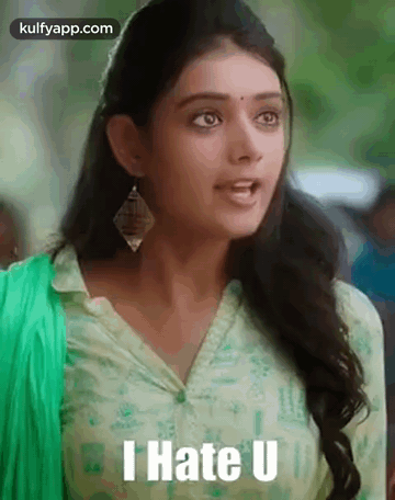 Neha Solanki expresses strong emotion, saying 'I Hate U' while wearing a green shirt and earrings.