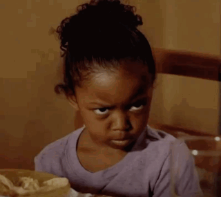 A little girl with an intense, angry stare sits at a table with a bowl of food, conveying a strong 'I hate you' expression.