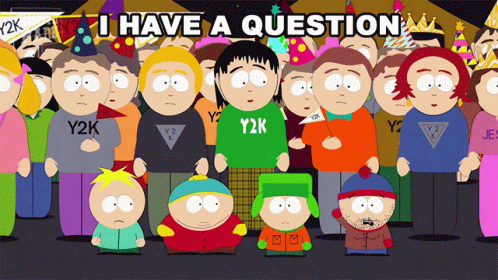 Stan Marsh, Eric Cartman, Kyle Broflovski, and Butters Stotch in a crowd, with Stan raising his hand to ask a question.