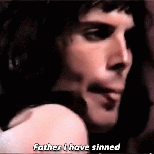 Freddie Mercury delivers a powerful performance, with the caption 'Father I have sinned' displayed.