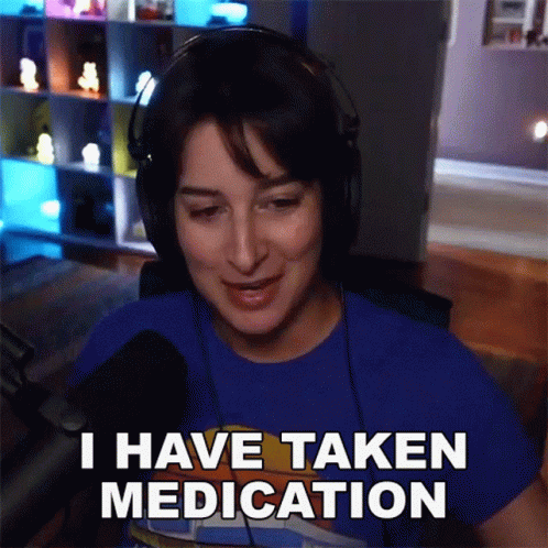 Alli Speed, wearing headphones and a blue shirt, states 'I have taken medication'.