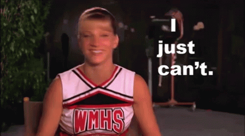 Brittany Pierce from Glee smiles and says 'I just can't' in her WMHS cheerleading uniform.